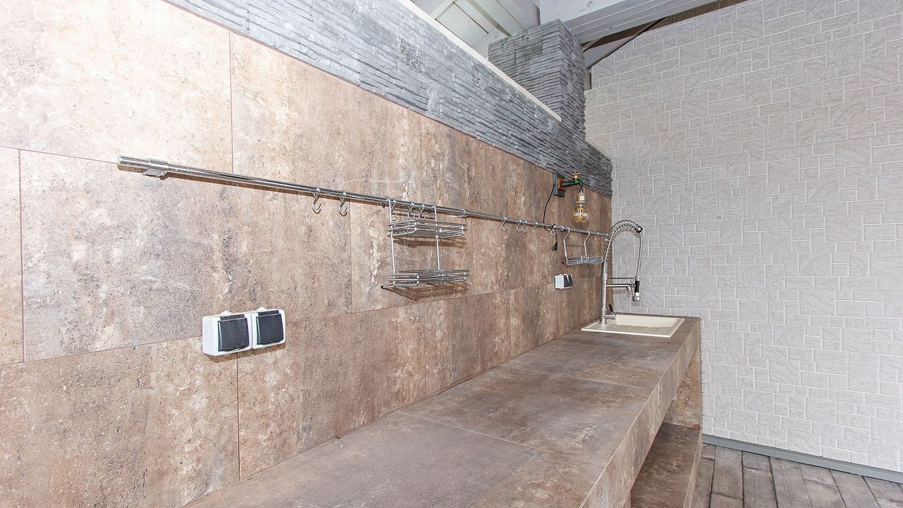 - облицовку стен и пола керамогранитом, рваным камнем, декоративной плиткой;
